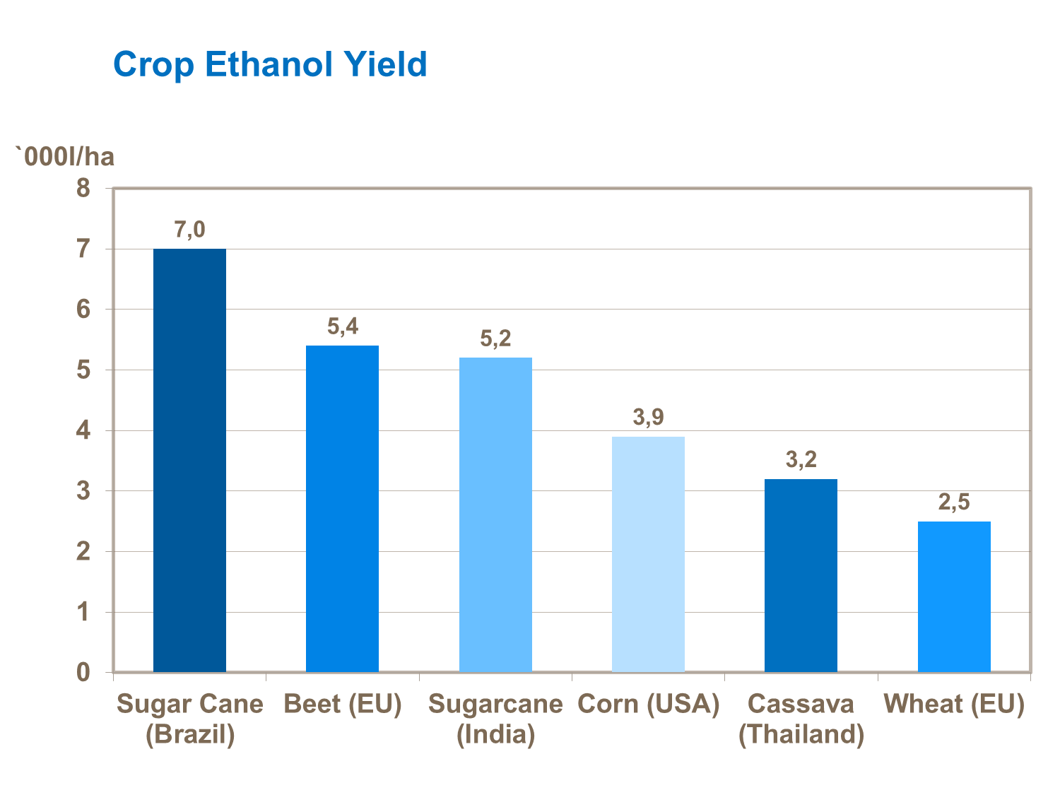 In comparison to ethanol from maize, wheat, sugar beet or sorghum, sugarcane produced ethanol has a higher net energy ratio and a lower level of CO2 emissions.