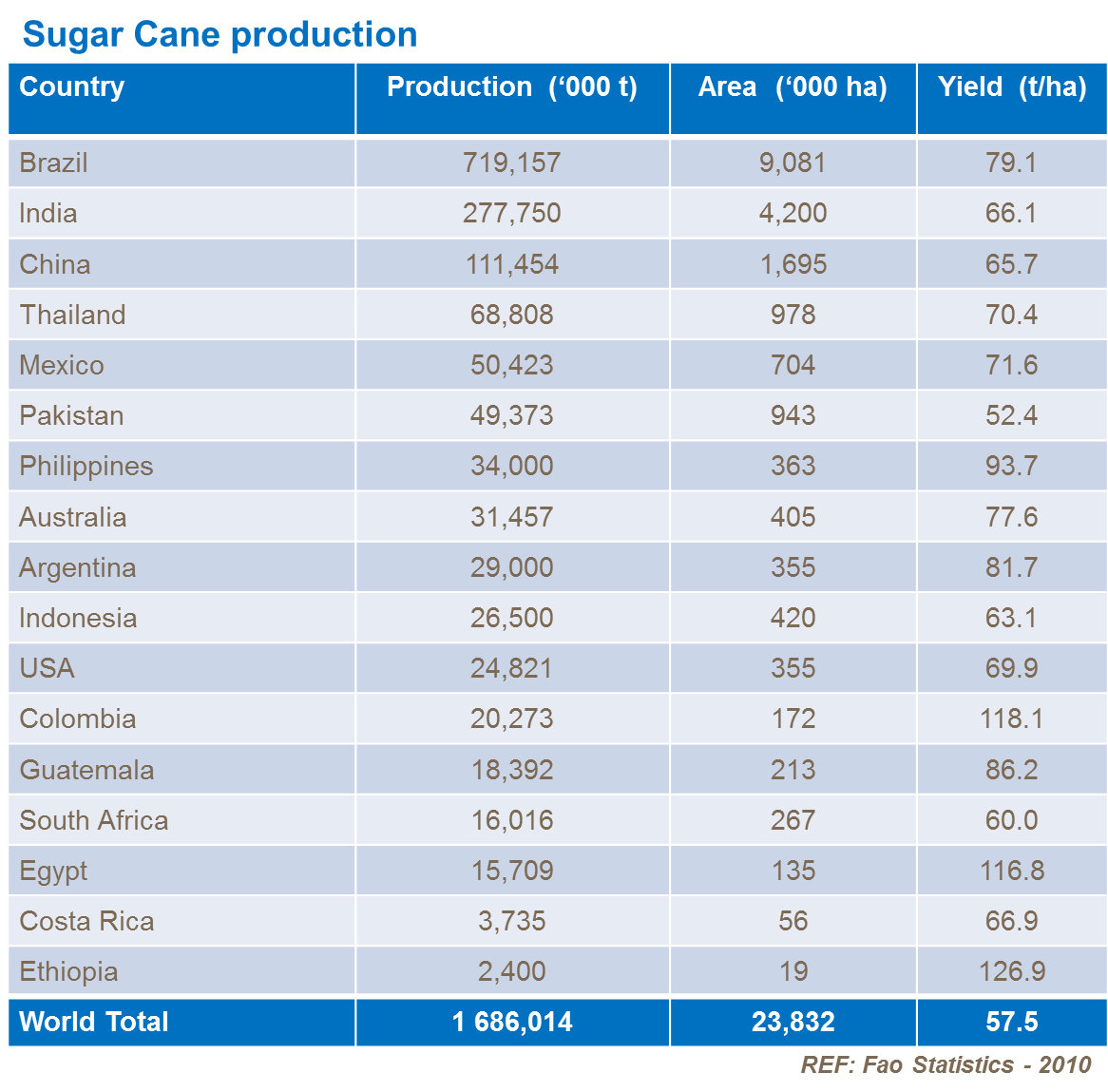 Combine this with the production figures from India and China and these three countries grow two-thirds of the world’s sugarcane crop from an area of nearly 15 million ha. Climatic factors, most notably water supply are the major influencing factors in production.