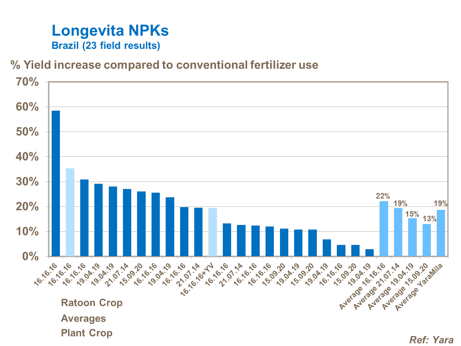 As a result of adopting this Longevita approach, two more harvests are possible over the sugar cane plant and ratoon crop cycle. While cumulative sugar cane yield over five years, using standard farm fertilizer practice totaled 380t/ha, the Longevita approach produced a 530t/ha sugar cane yield from seven harvests, bringing a cost saving of 30% over the life of the cane crop. The trials also show a 6-11t/ha increase in yield from each harvest across the life of the sugar cane crop.