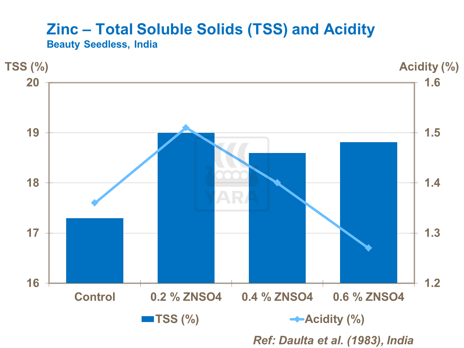 Zinc is involved in the process of chloroplast development, thus it is essential for improvement of grape quality. Foliar zinc application resulted in the increase in sugar content.