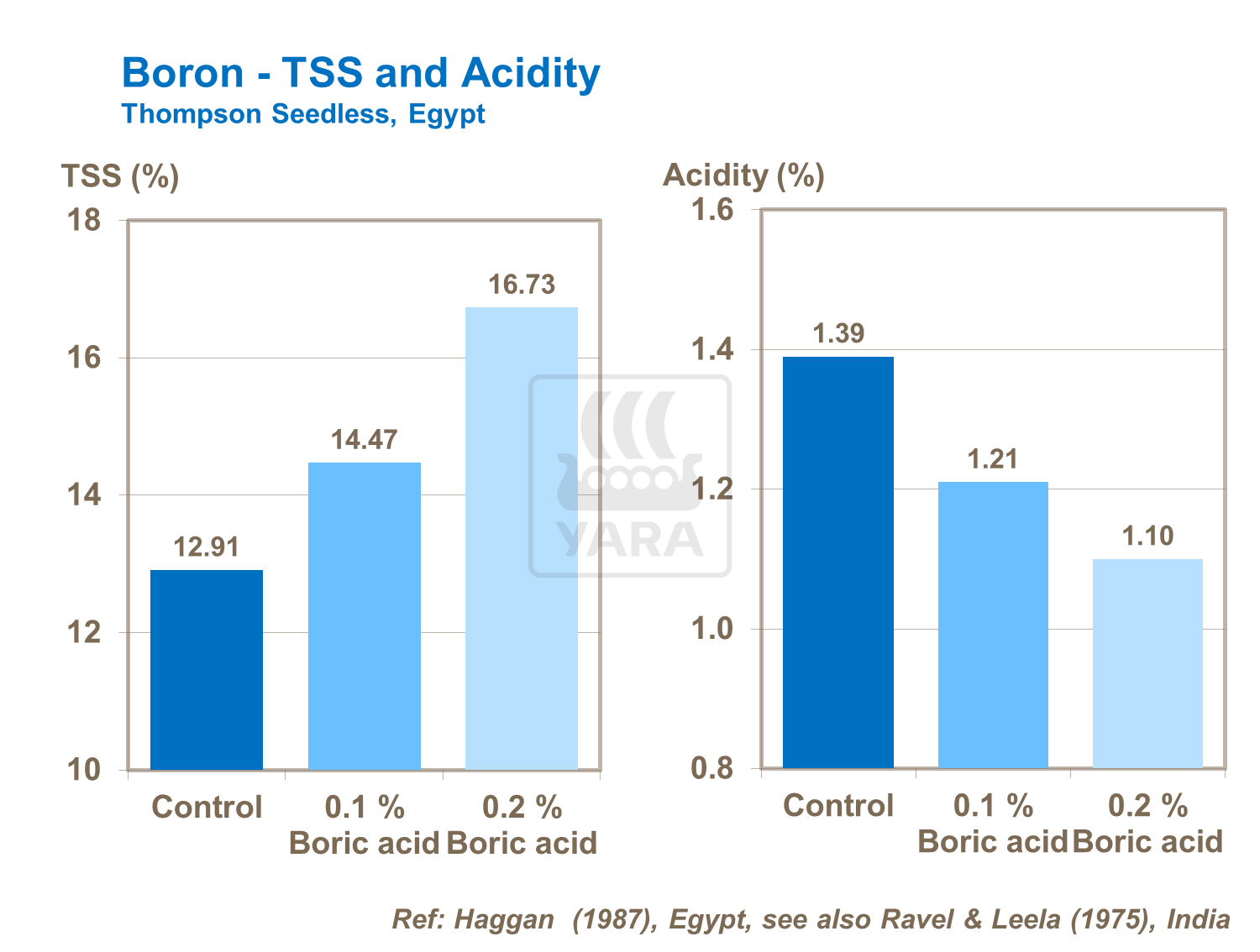 Foliar boron also helps improve grape quality by increasing the TSS content and reducing acidity of table grapes.