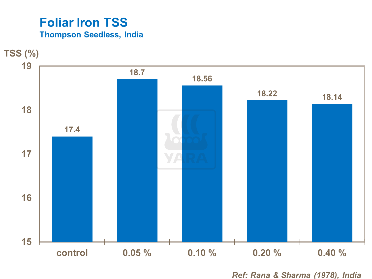 Optimum levels of iron increased TSS contents in grapes according to Indian research. Iron is essentially required for early leaf production and photosynthesis to ensure better berry development and quality. Supply of sufficient amount of iron fertilizer resulted in an increased sugar content.