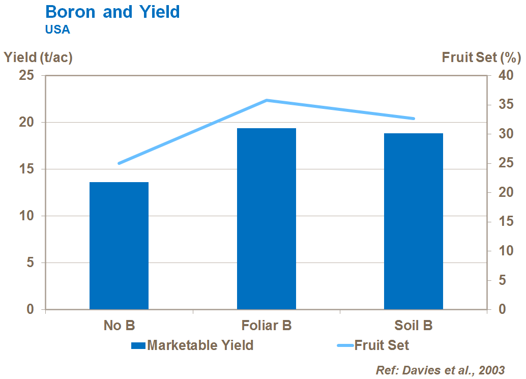 Boron plays an important role in pollen germination and tomato fruit set. Pre-flowering applications ensure good fruit set and full yield potentials are achieved. While boron is quickly taken up from the soil, it is relatively immobile in the plant, so foliar sprays are often more effective.