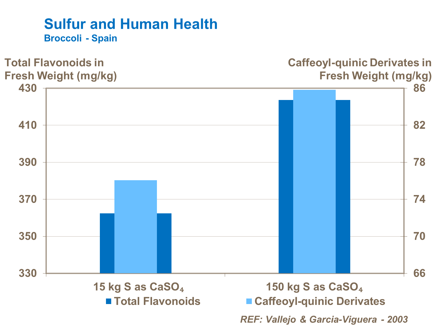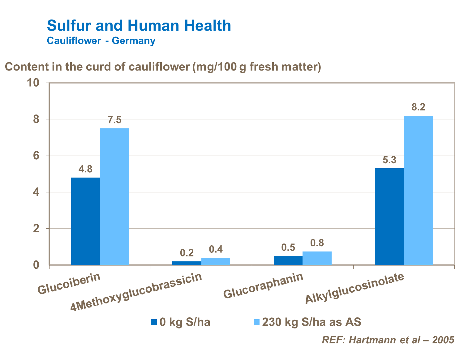Good sulfur nutrition leads to an increase in compounds known to improve human health. These include phenolic compounds and glucosinolates. Phenolic compounds - namely caffeic acid derivates and flavonols - have been linked to the reduction of chronic diseases and reduced risks of cancer. Glucosinolates, as well as adding to taste and improving a plant’s ability to resist stress, are also anticarcinogens.