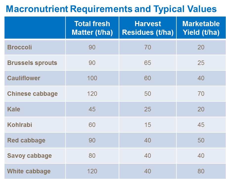 Calcium is probably the third most important nutrient needed by brassicas. The nutrient ensures vigorous leaf, root and canopy growth. Supplies need to be maintained throughout growth to maximize uptake. Calcium also has a key role to play in maintaining crop quality. Even though the total calcium uptake of brassica crops is high, the quantity of it which is finally removed from the field at harvest is usually relatively low.