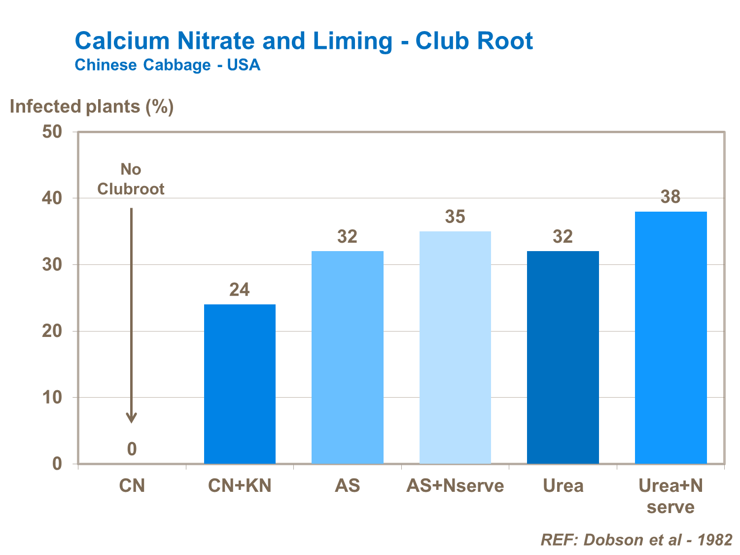 In addition, calcium, from highly soluble calcium nitrate, further minimizes the risk of club root infection. Other fertilizers and other calcium sources (e.g. CAN) are not as effective as calcium nitrate. There is an indication from some trials that in certain situations, boron can also play a role in minimizing clubroot.