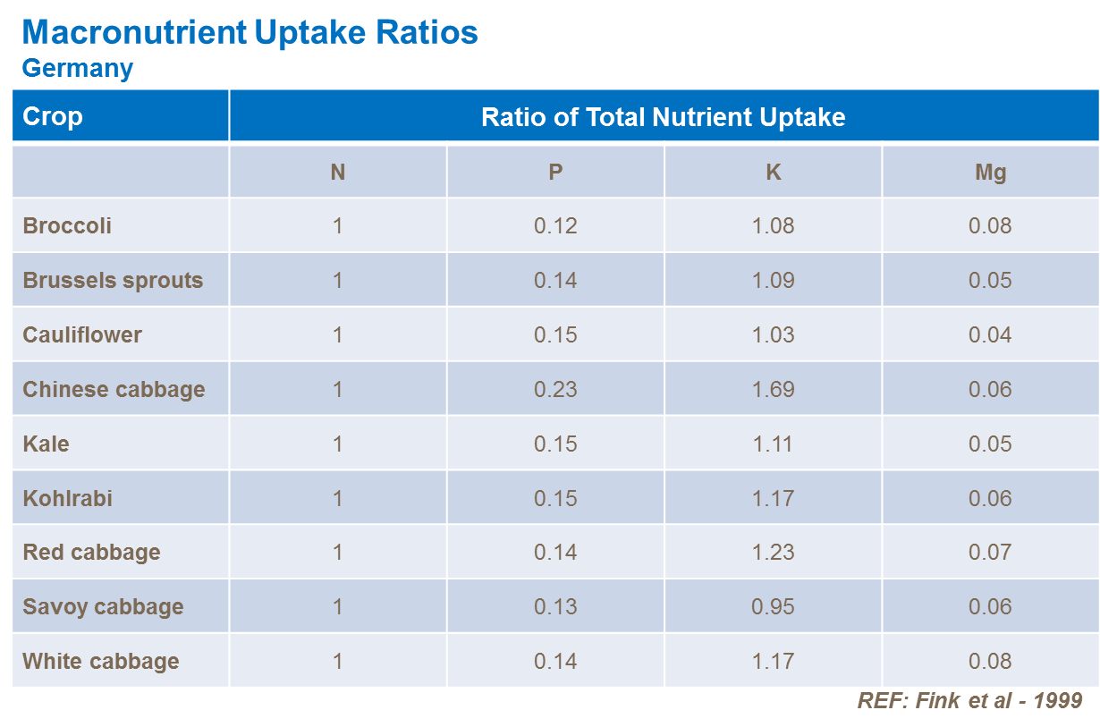 Where potassium, magnesium or calcium is available in excess, then uptake of the other cations is reduced. Common macronutrient ratios for nitrogen to potassium, phosphorus and magnesium for different brassica crops are shown here. Tissue analysis will confirm visible deficiency symptoms and reveal hidden deficiencies where visual plant symptoms are not yet present. The type, position and timing of the tissue selected for tissue analysis varies according to local practice.