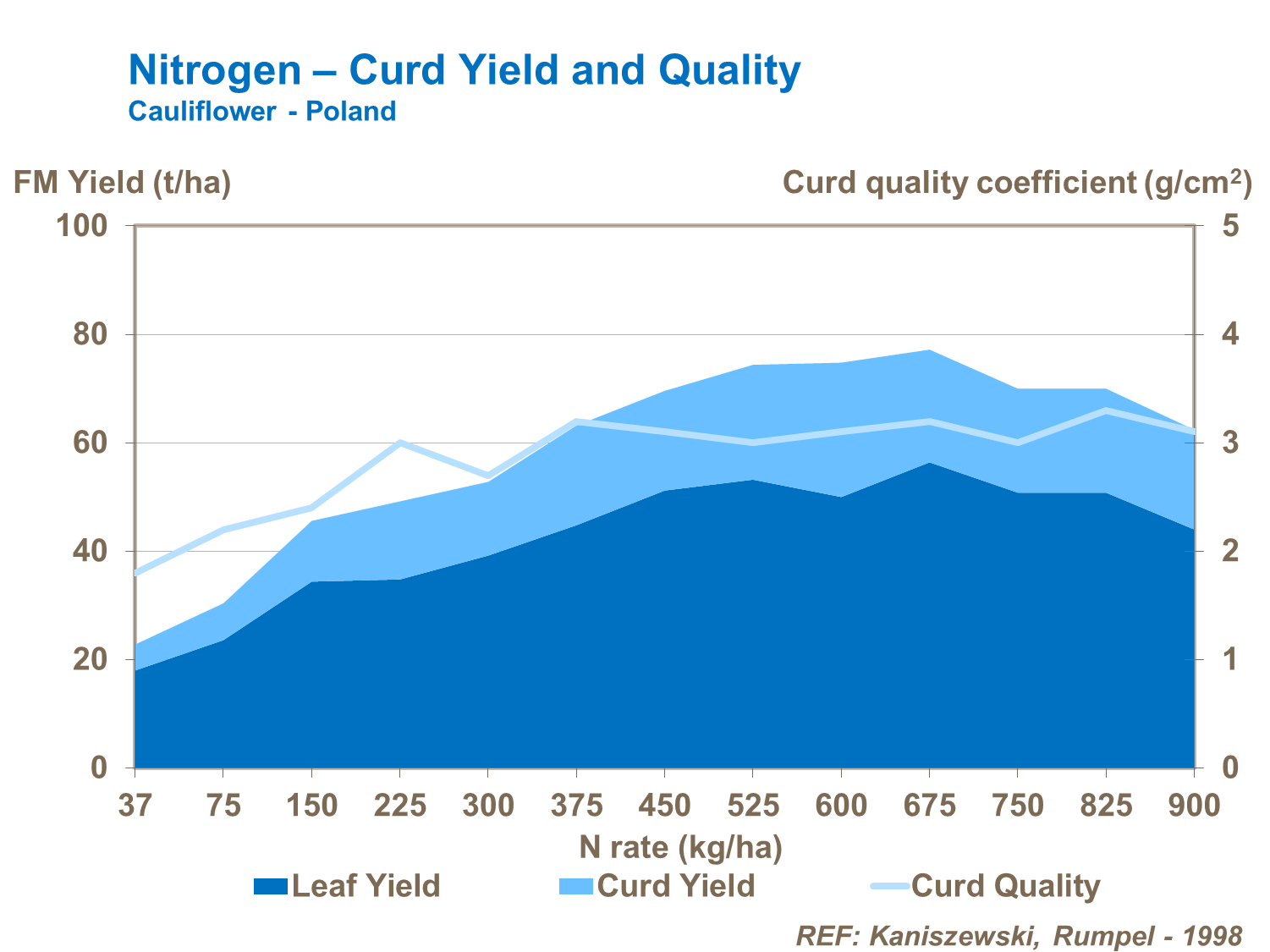 The total nitrogen uptake of brassica crops is often between 200 - 400kg N/ha. However rates of up to 600kg/ha produce yield responses at no loss in curd quality in cauliflowers and broccoli. In these crops, nitrogen determines the balance between vegetative and reproductive growth.