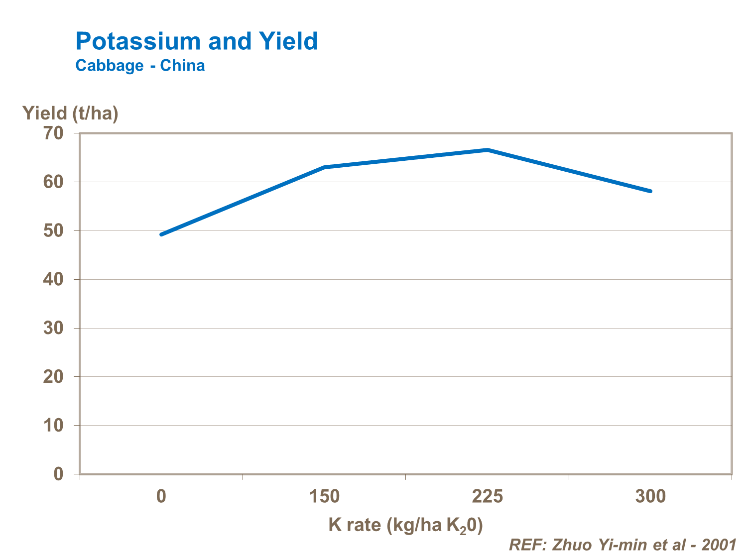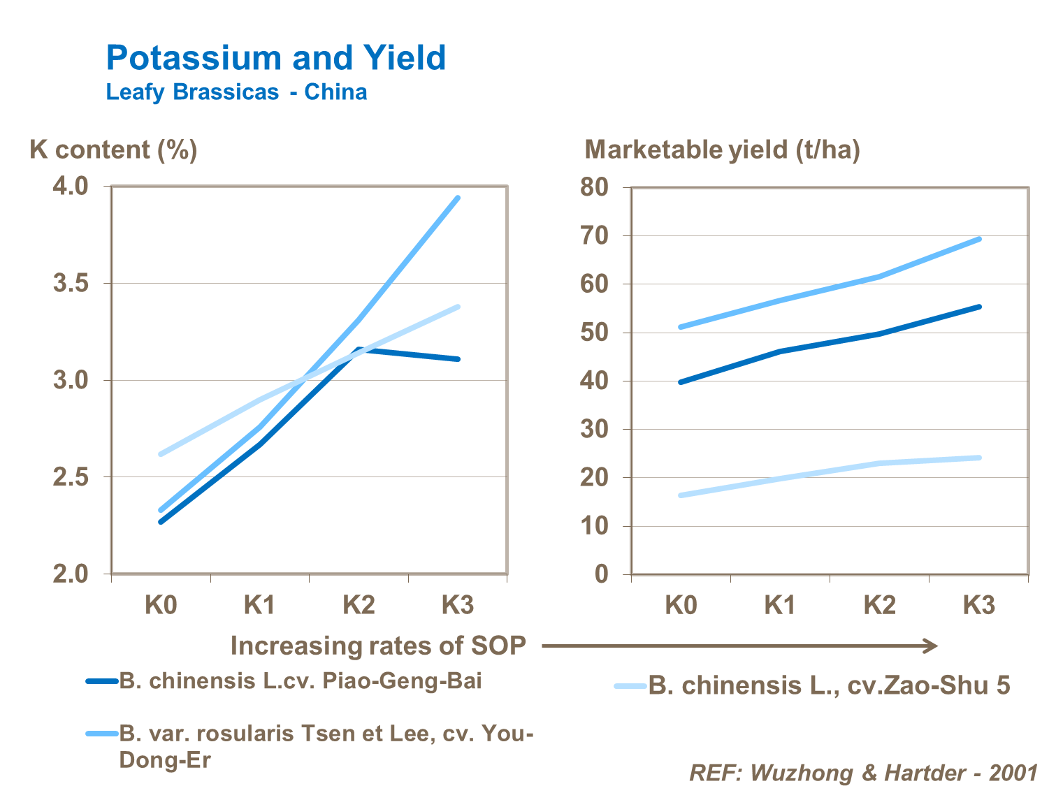 Potassium rates of 225 kg/ha and above produce responses on high yielding sites, increasing both plant biomass and resultant head weight and yield.
