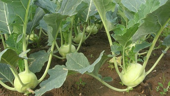 Kohlrabi is a cabbage relative, grown for the turnip-like enlargement of the stem just above ground level. Plants are commonly transplanted and must be grown rapidly to provide good quality ‘bulbs’. Leaves rise from the enlarged globe-like or flattened bulb which is usually 5-8 cm in diameter at harvest.