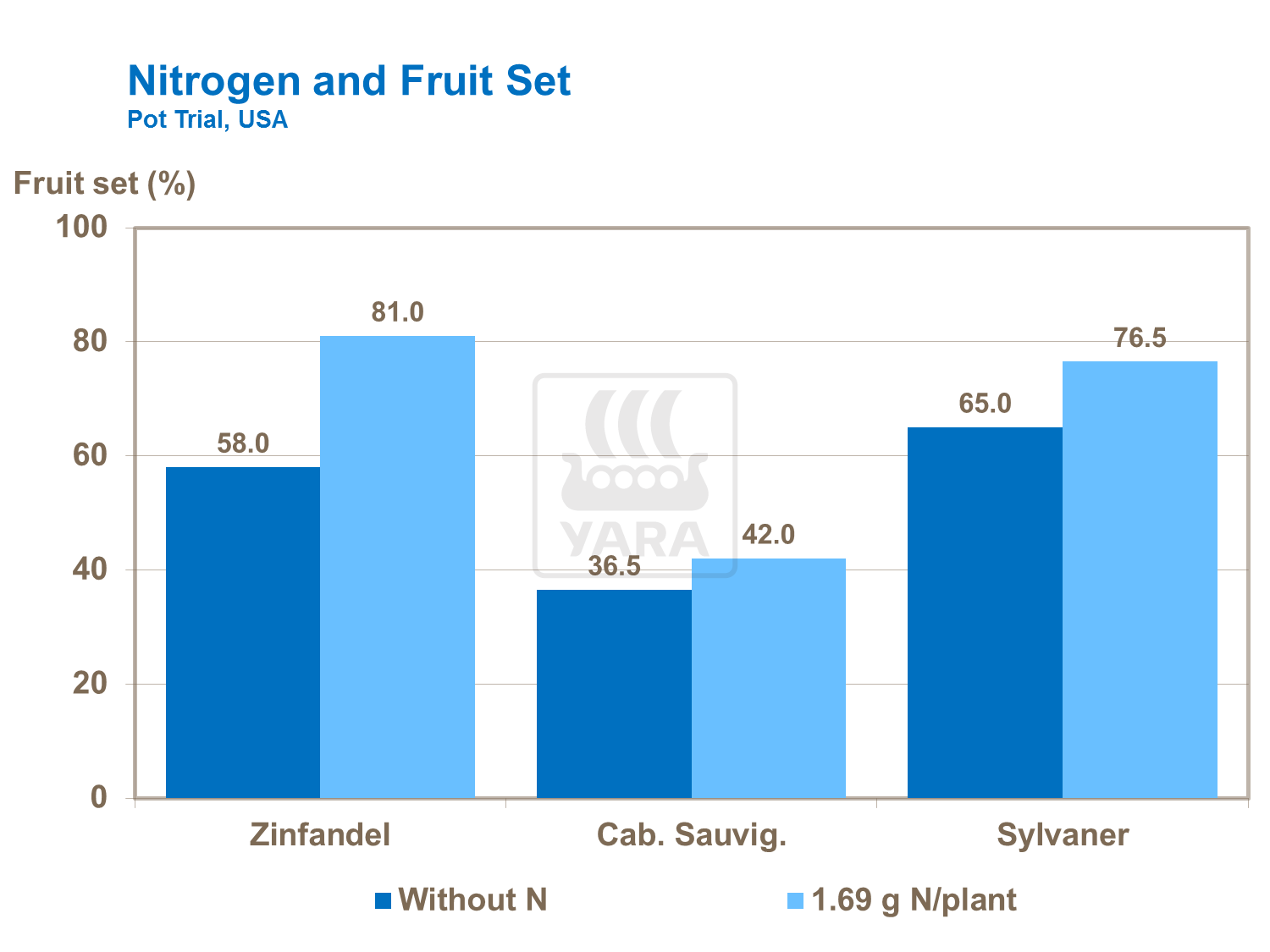 Trials show that applications of nitrogen at flowering increases wine grape berry set. High rates of N will increase wine grape yield. In work by Nielsen et al, N yield responses hadn`t peaked at applications of 300kg/ha and there was a similar correlation with grape bunch weight in two out of three years of this trials.