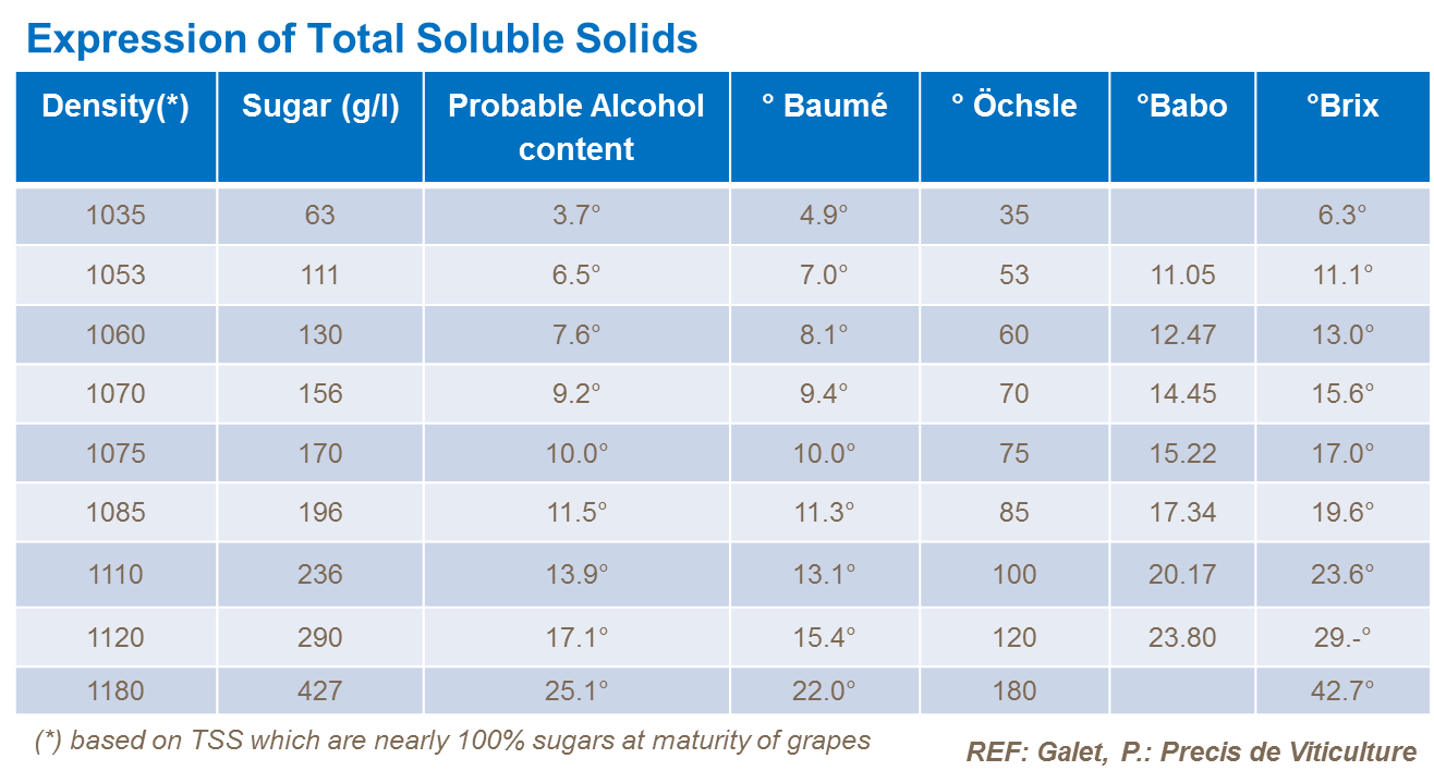 Sugar content is measured and expressed as °Brix – or °Baumé, °Öchsle, °Babo. The °Brix value varies according to the type of grape and levels are set for the style of the wine produced by each winery.