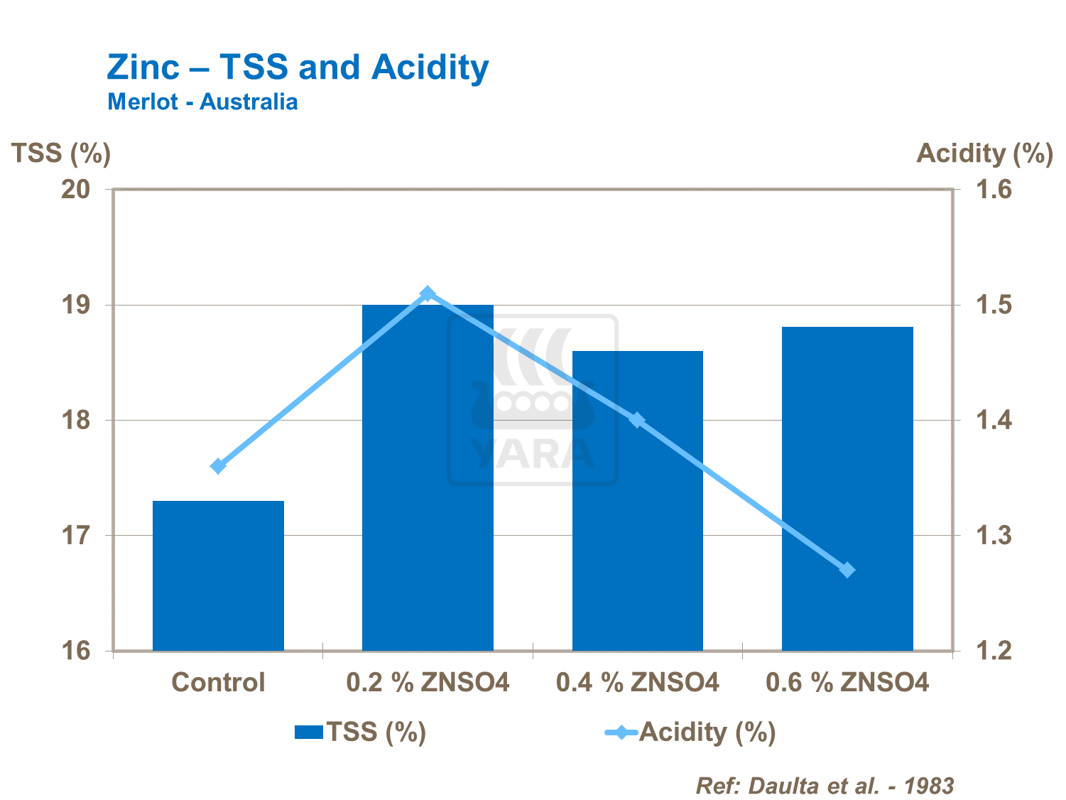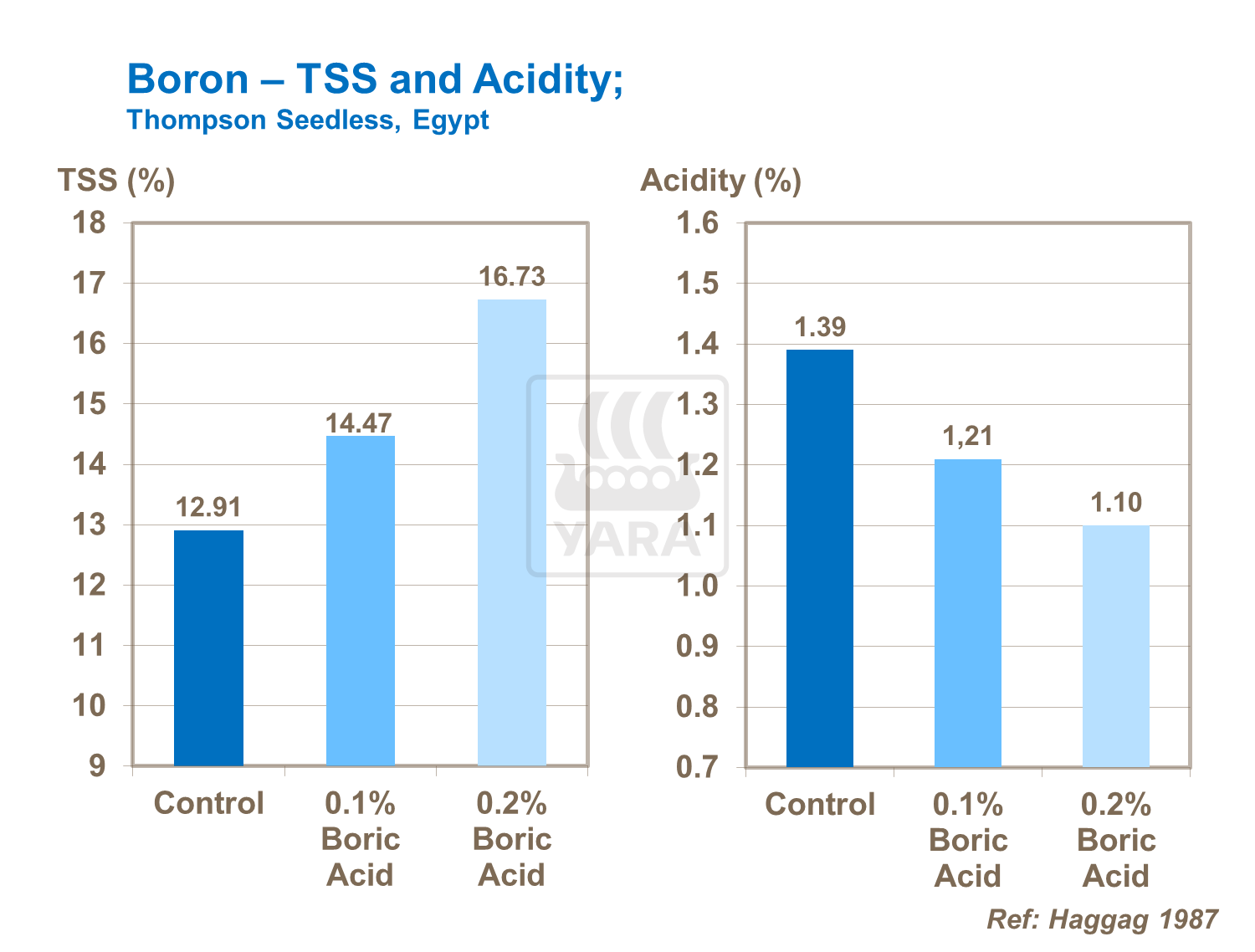 Foliar boron and zinc also help improve grape quality by increasing TSS content and reducing acidity.