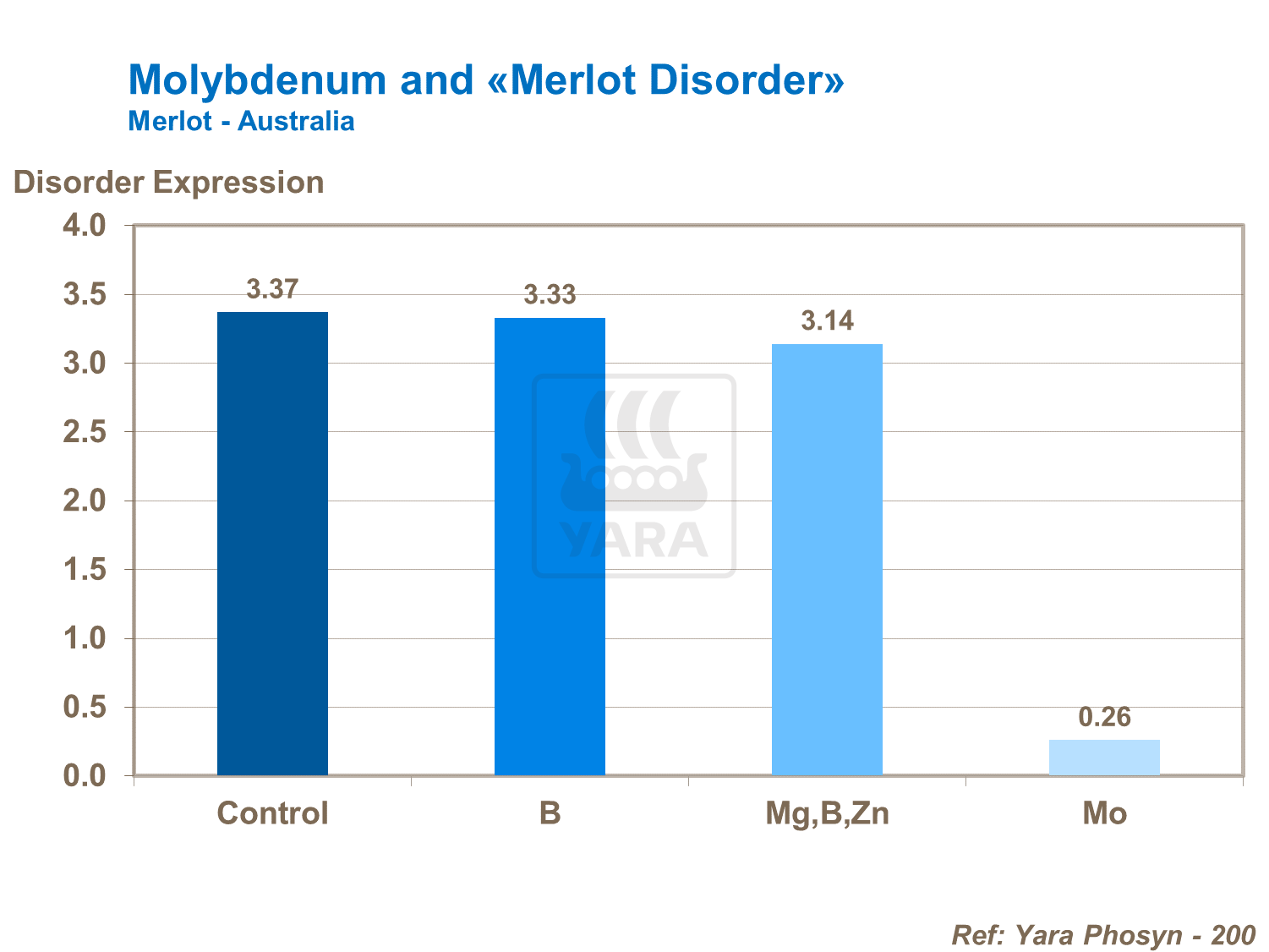 Young vines with high levels of nitrate in the tissue often die or remain unproductive throughout the life of the vine. The disorder is known as ‘Merlot Disorder’. Symptoms of “Merlot disorder” are smaller leaves than usual, leaf-edge burn, poor leaf color and the wood fails to mature. Application of molybdenum significantly reduced the level of disorder.