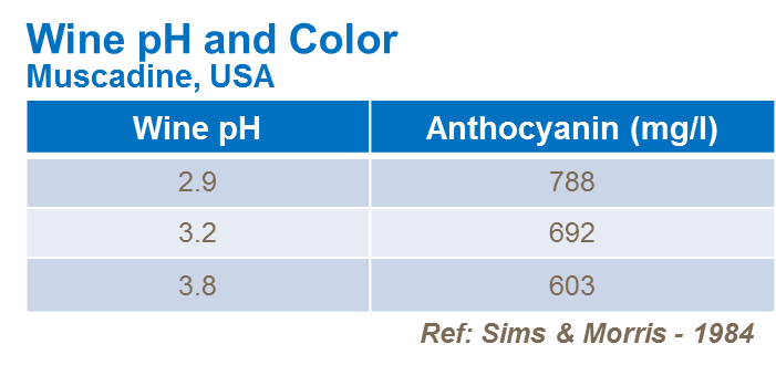 High pH values can also alter the color of anthocyanin solutions – responsible for red wine color - by changing the structure of the anthocyanin molecule, which becomes bluer and therefore less desirable.
