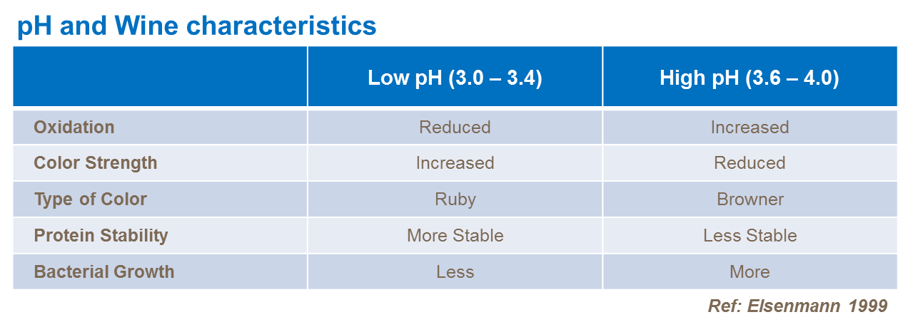 The pH of the juice/must affects the taste, sugar/acid balance and stability of wines. In red wine the color is also effected. It is determined by the balance of the major anions (malate and tartrate) and presence or absence of major cations (mainly K).