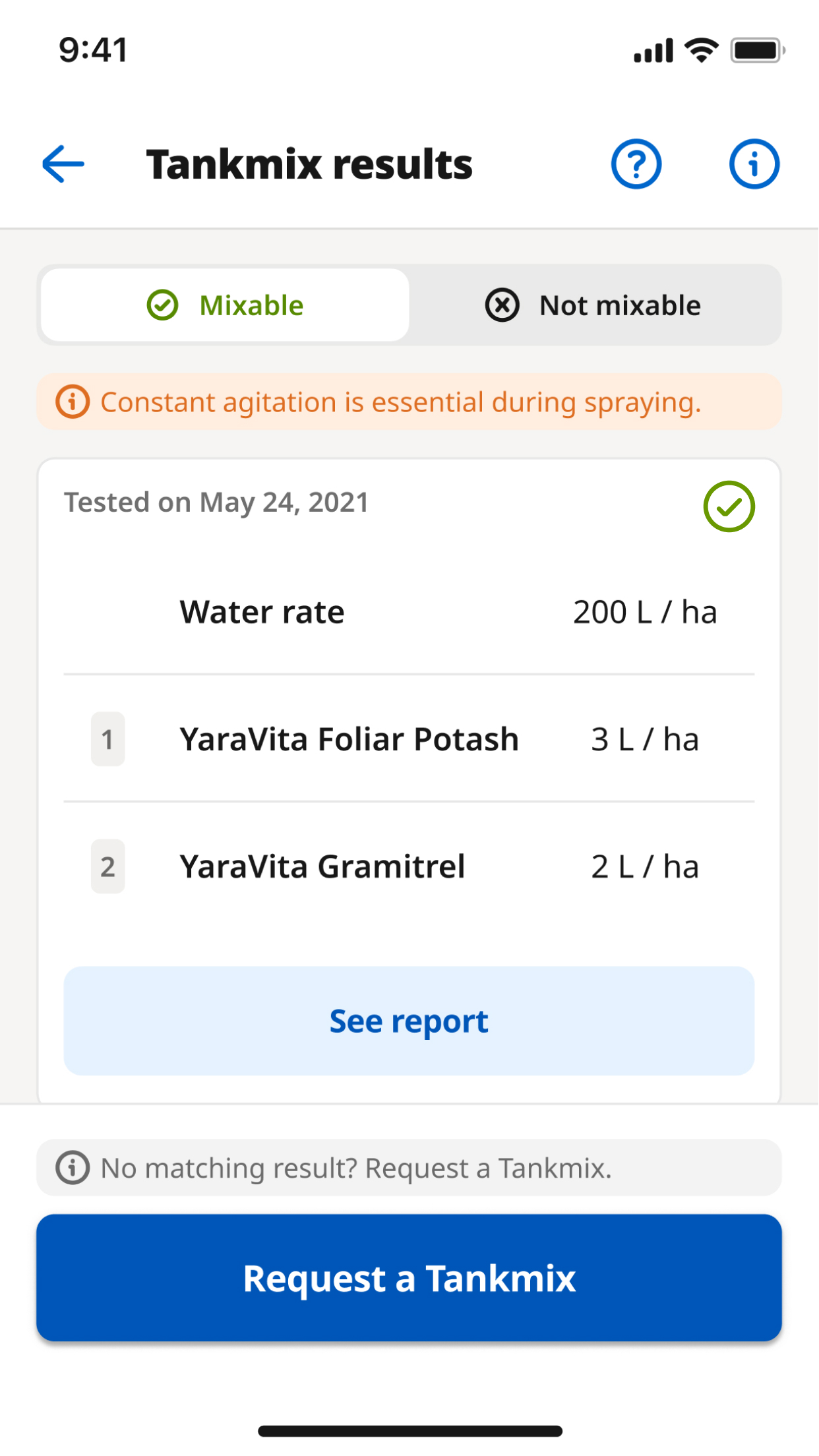 Yara Tankmix is the trusted digital tool to check the mixability of YaraVita with various crop protection products or other YaraVita products to optimise your spray programs. With thousands of mix combinations tested according to BS EN ISO 9001:2000 guidelines, Yara Tankmix is your reliable adviser in case of doubt.